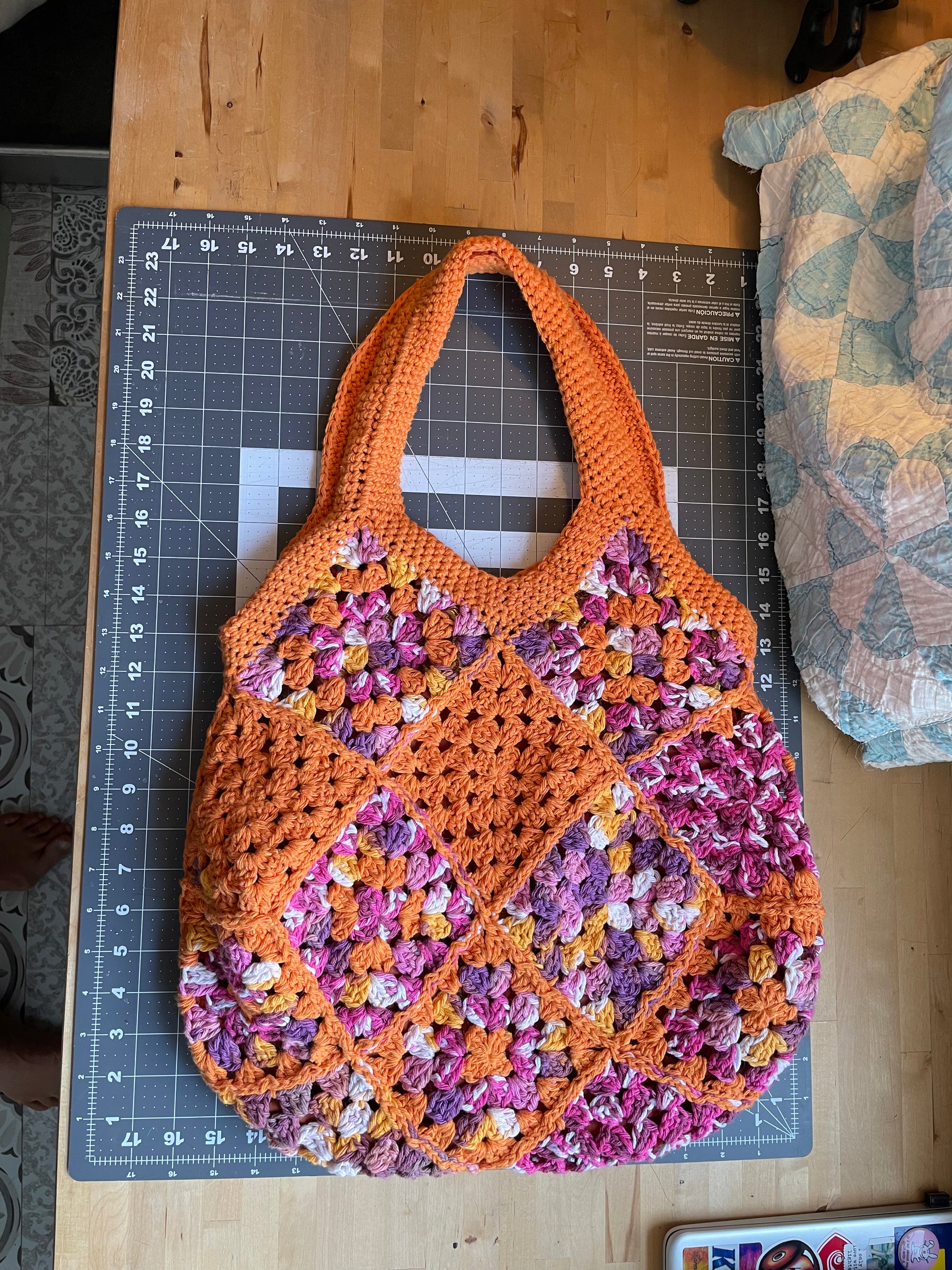 Add a joyful pop of color and vintage charm to your day with this handmade crochet tote! Each granny square was crocheted by hand using 100% cotton yarn in a rich mix of oranges, pinks, and  cream.