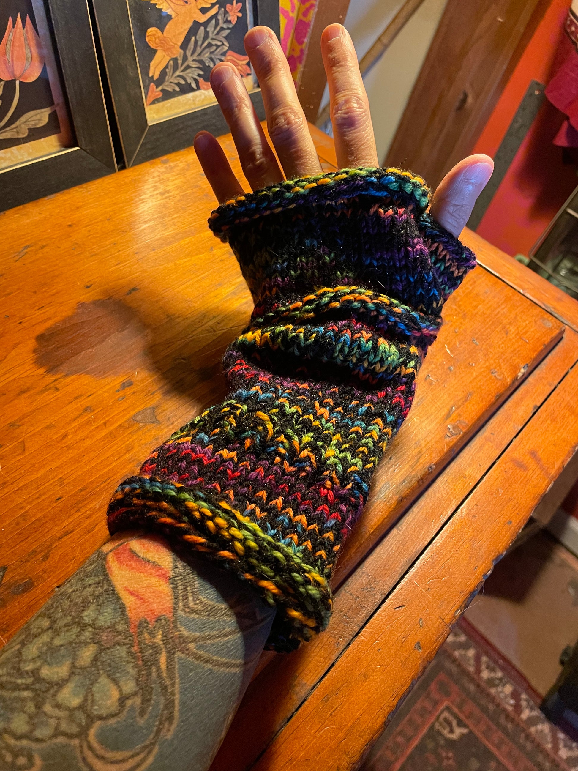 These fingerless gloves are made from high-quality wool that is soft, durable, and breathable. Knitted using two strands of wool twisted together creating a dark rainbow marled effect . Whether you need them for skiing, hiking, or just walking your pup around the city, these gloves will keep your hands toasty and comfortable.