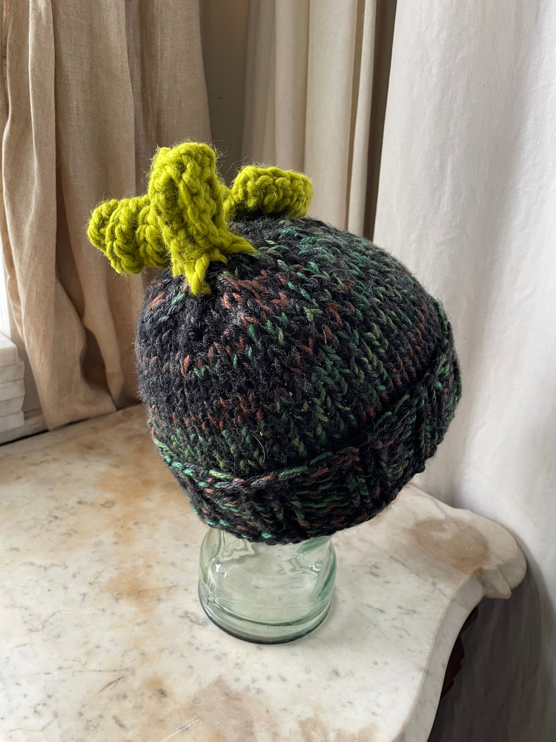 - Playful design — a cozy beanie with a whimsical stem + leaf on top
