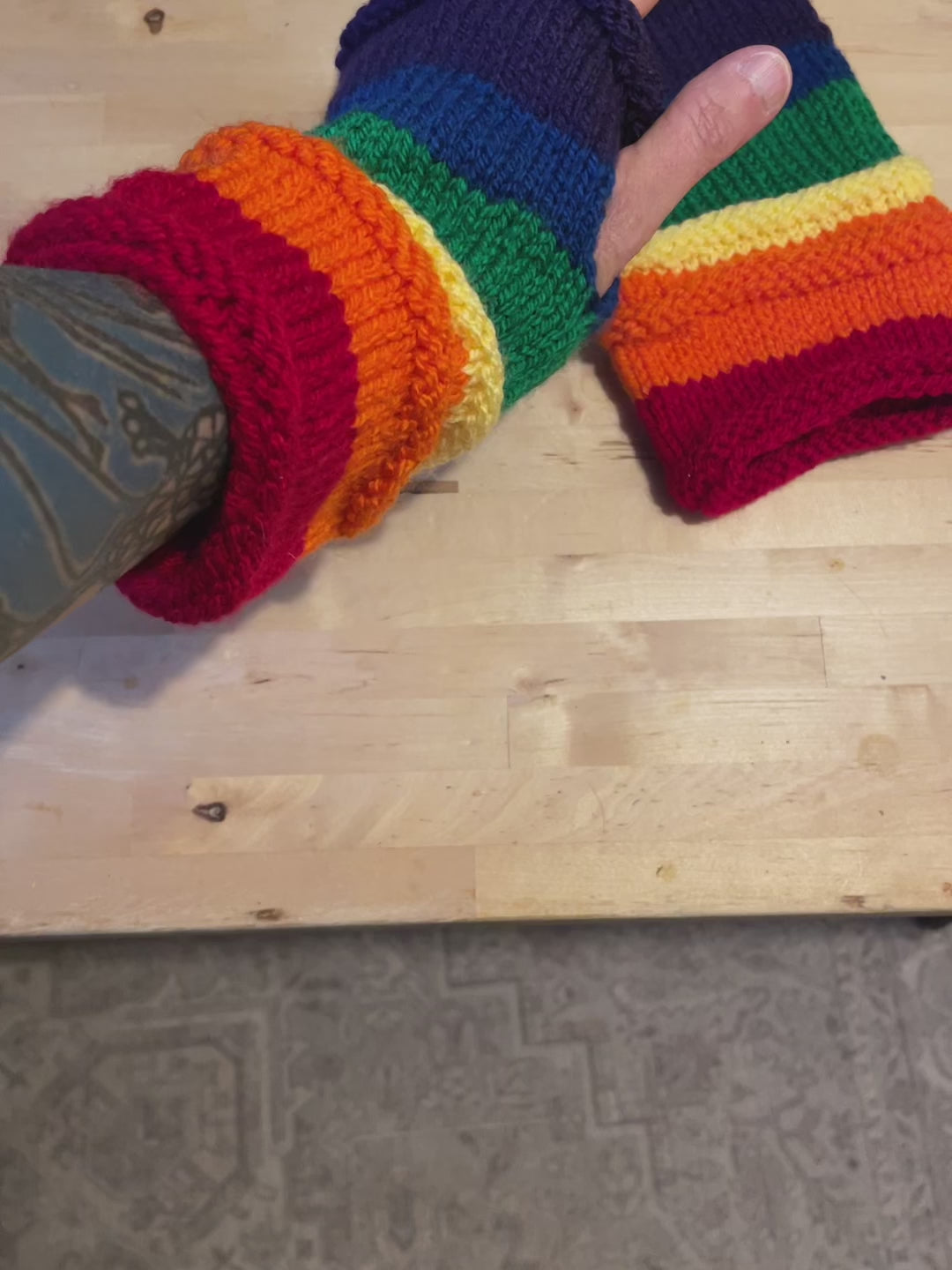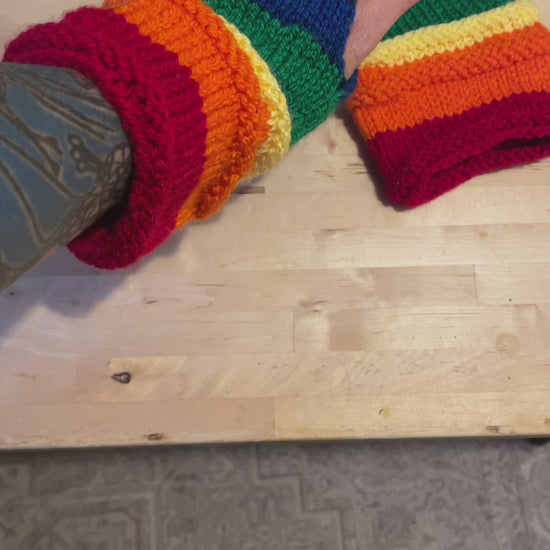 Keep your hands warm and stylish with these cozy rainbow striped fingerless gloves. These gloves are perfect for adding a splash of color to your outfit, while still allowing you to use your fingers for texting, typing, or crafting. They are nearly 8" long and generously sized large, so they fit most hands comfortably. They are made of soft and durable acrylic yarn, which is easy to wash and dry. Whether you need them for work, school, or play, these gloves will brighten up your day and keep you cozy. Feel free to ask any questions and thanks for looking!