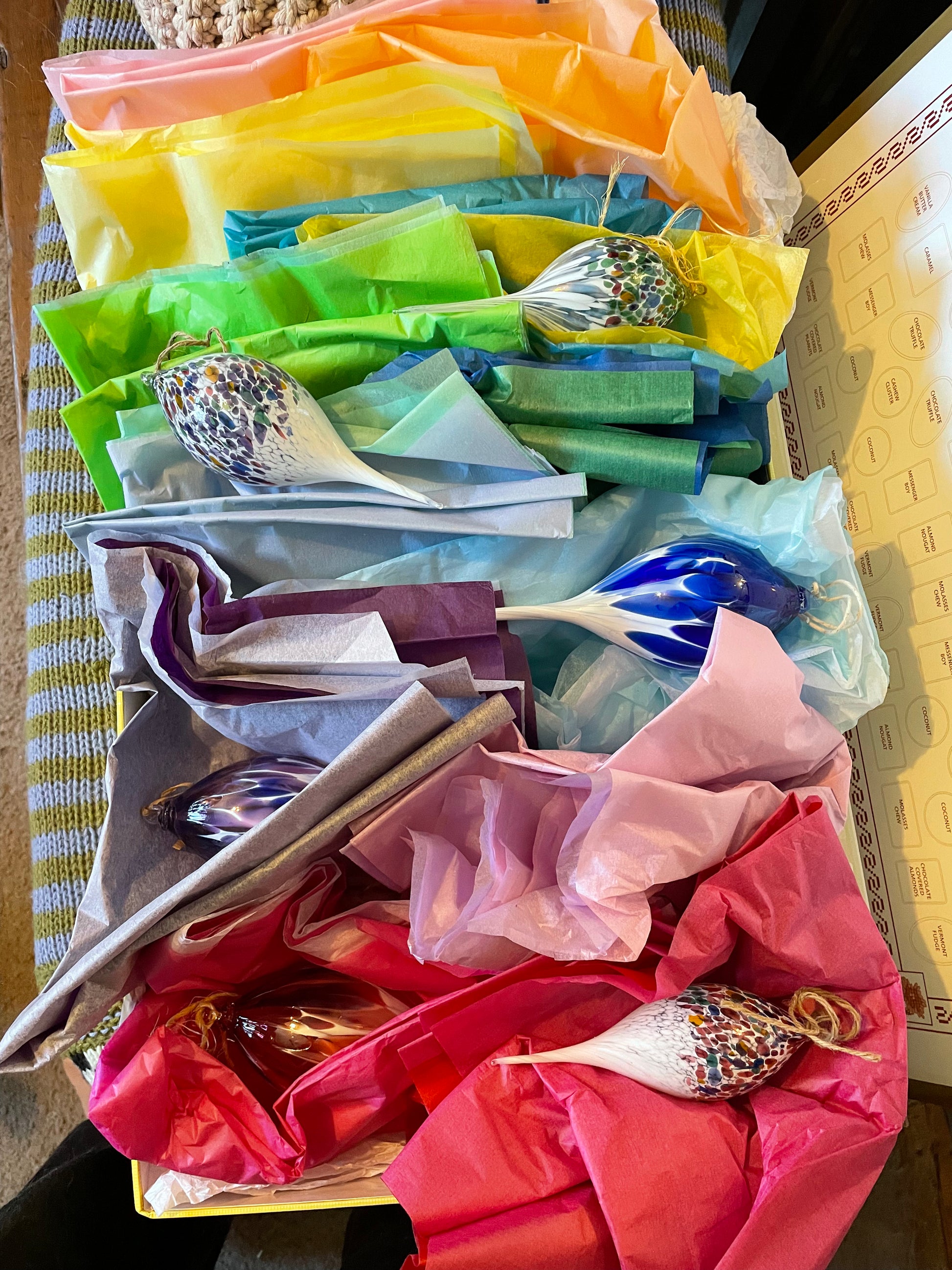 Beautiful and one of a kind hand blown glass tear drop finial shape treasure created here in Philadelphia . These gorgeous sun catching ornaments are not just for Christmas any more! Hang this multicolored speckled and white orb in the window and watch the sunlight play. Approximately 6” in length! Each varies because of the nature of being made by hand. Thanks for looking!