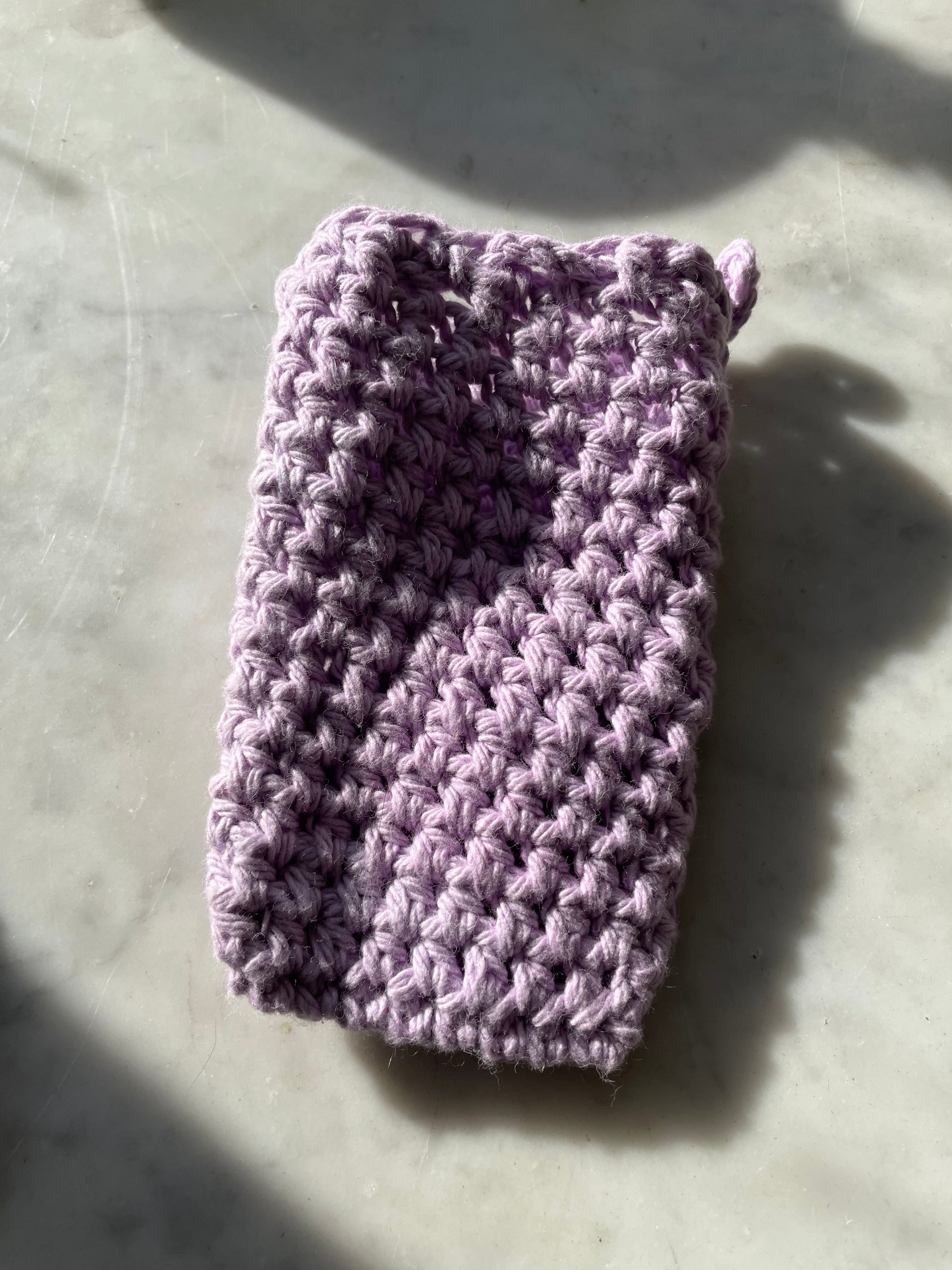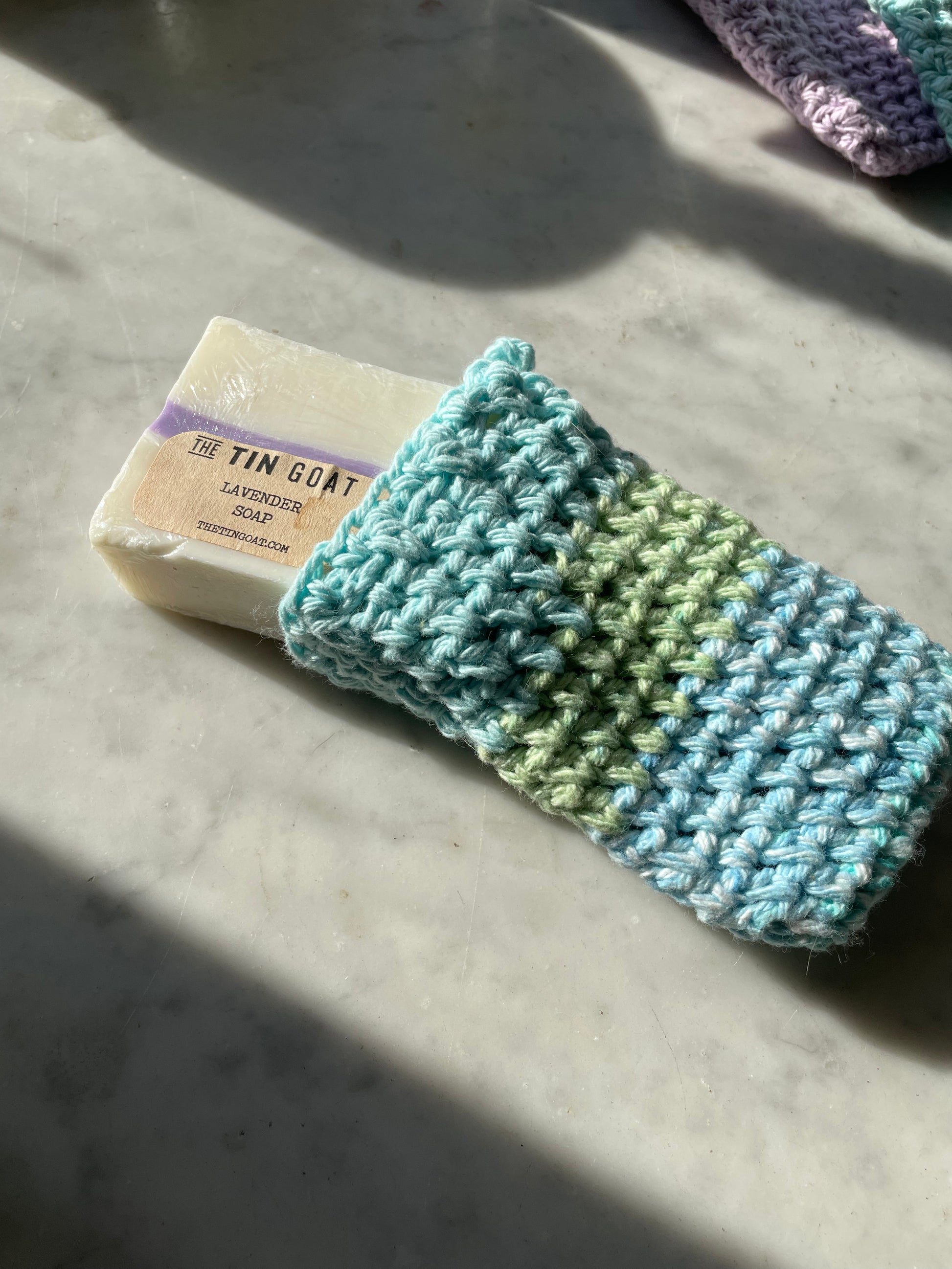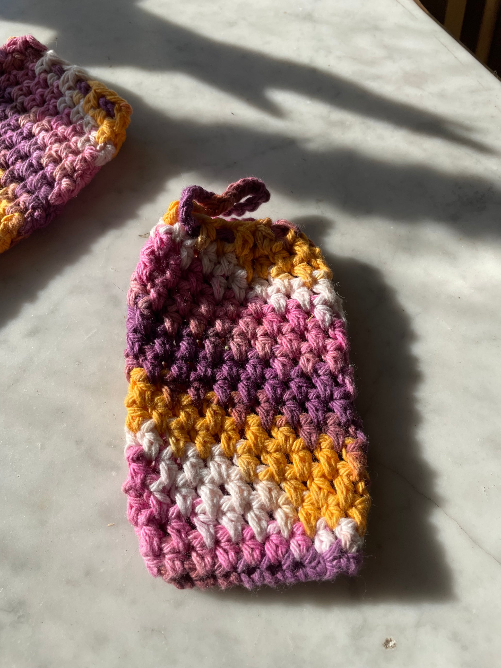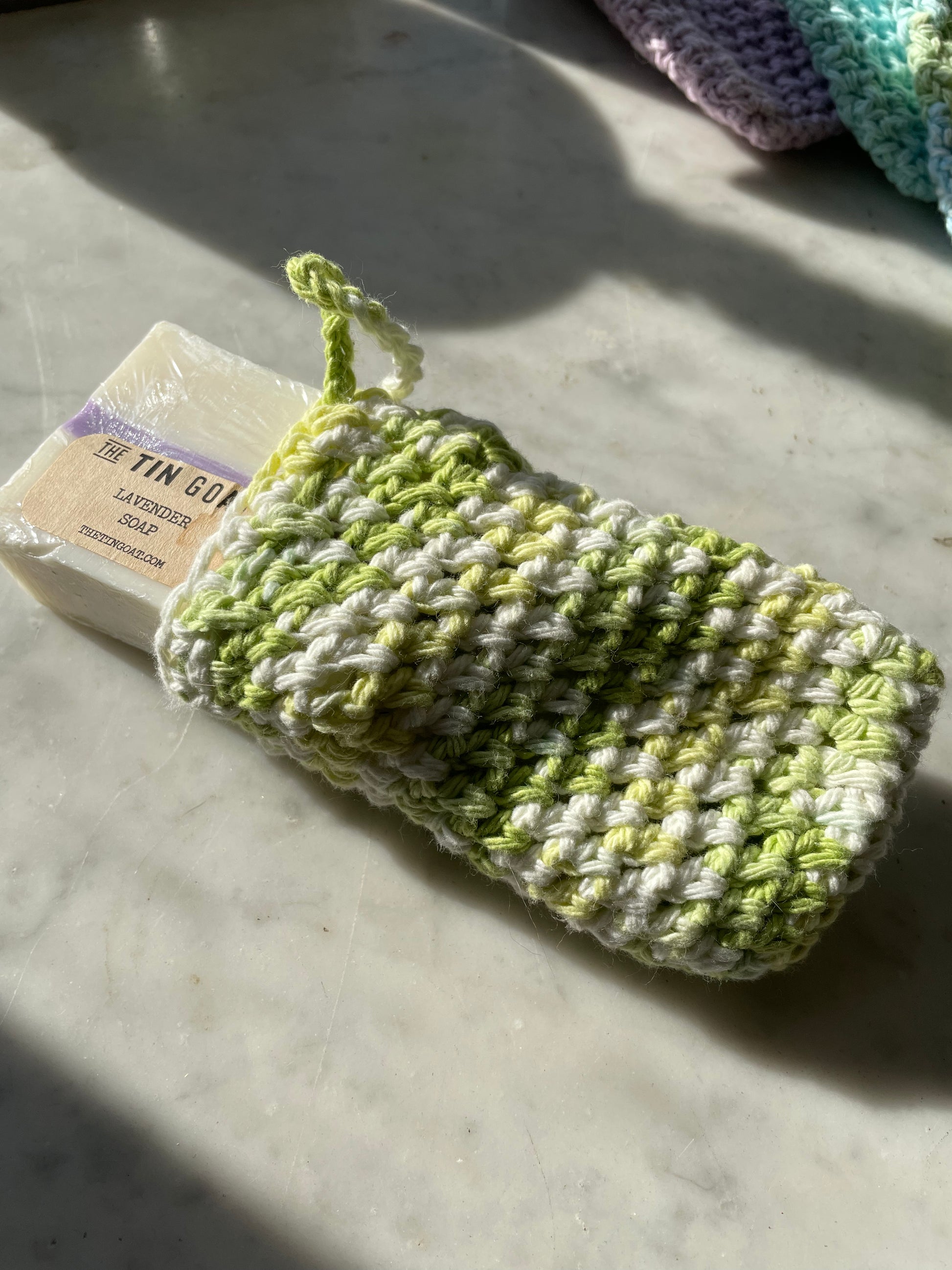 Waste nothing with these soap savers. Each hand crocheted pouch fits a standard bar of soap ( not included) , used to the last sliver. You can also save all your soap ends in one to use them all up! 100% cotton, these cuties are durable and washable . Just slip the soap inside and use the drawstring to close and hang the pouch between showers or baths.
